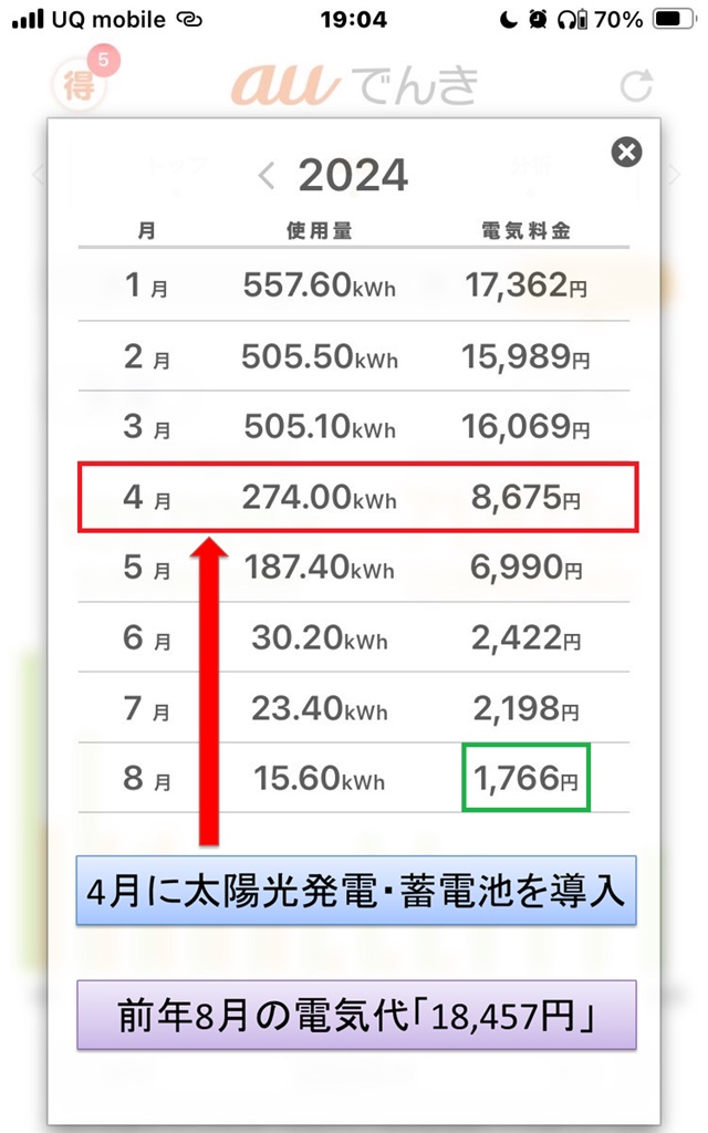 また、蓄電池に搭載されたAI機能による節電効果も加わり、 8月には電気代が1,700円台にまで低下!