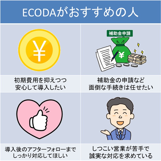 また、ECODAは誠実な対応を徹底しており、強引な営業・勧誘は一切ありません。
