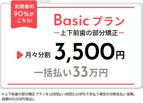 Oh my teethで最も人気なのが、上下前歯の部分矯正ができる「Basicプラン」で、月々3,500円から※始められます。