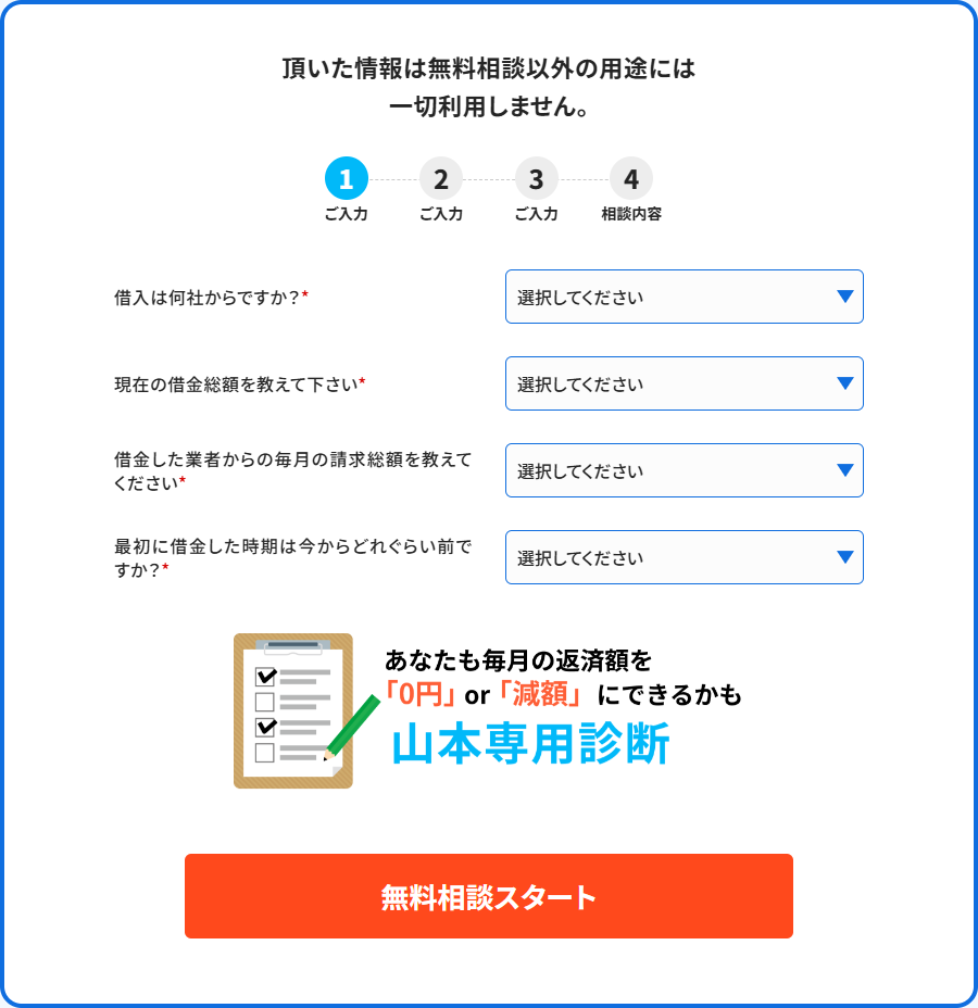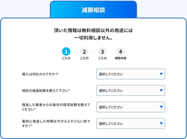 借入件数・借入金額を入力するだけで、債務整理によって「今ある借金がどのくらい減らせる可能性があるか」を無料で相談できます。