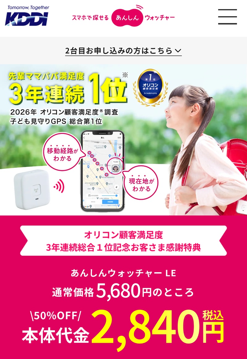 あんしんウォッチャー(LE)は、KDDIが提供する見守りGPS。居場所・移動履歴の確認はもちろん、本体ボタンの長押しでお子さまから現在地を知らせることもできます。
