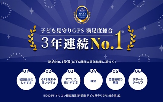 ※6:全国で、子ども向け専用のGPS端末機の販売及び当該GPS端末機とスマートフォンアプリを通じた見守りサービスを提供している14社の子ども見守りGPSサービスに関し、2023年10月26日~11月1日、2024年9月18日~9月25日、2025年10月10日~10月20日のインターネット調査を実施した結果、2026年にオリコン株式会社が発表した「子ども見守りGPSランキング」において、総合1位を獲得(6項目の評価結果に基づく)