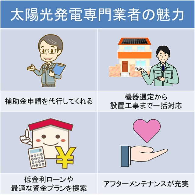 太陽光発電専門業者とは、補助金の申請から機器の選定・設置工事までを一括でサポートしてくれる業者のこと。