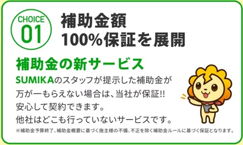 スタッフが提示した補助金が万が一もらえなかった場合は、その金額を100%保証するSUMIKA独自の「保証制度」が適用されます。