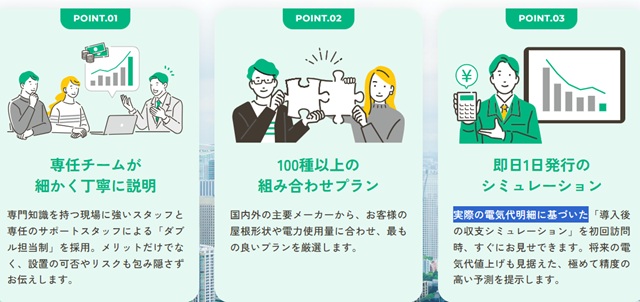 設置前に、どのくらい電気代を削減できるかなども確認でき、納得したうえで導入が進められます。