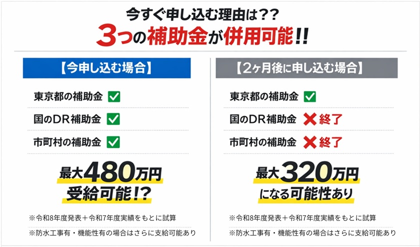 ただし注意したいのが、補助金は複数の制度を併用できる一方、受付終了も早く、タイミングによっては「受給額」に差が出るということ。
