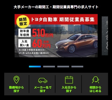当サイトでは【高収入】【寮完備】【正社員登用あり】を満たした、おすすめの期間工(自動車メーカー)求人をまとめました。