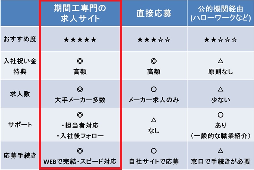 また、期間工が初めての方向けに「求人の探し方」「おすすめの応募方法」もご紹介しているので、ぜひ最後までご覧ください。