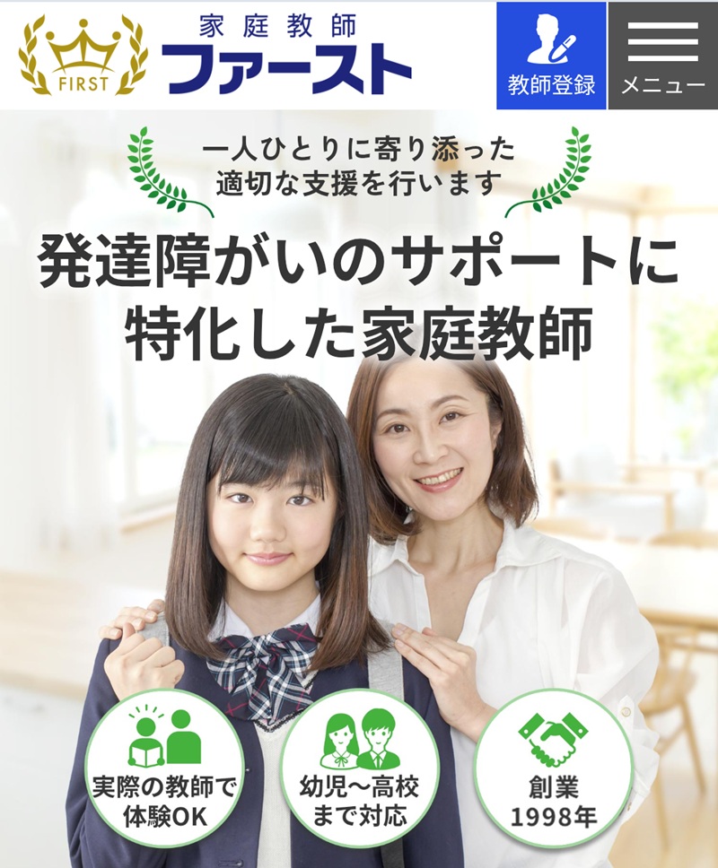 家庭教師ファーストは、発達障害のあるお子さま一人ひとりの状況を丁寧にヒアリングしたうえで、学習をサポートする家庭教師サービスです。